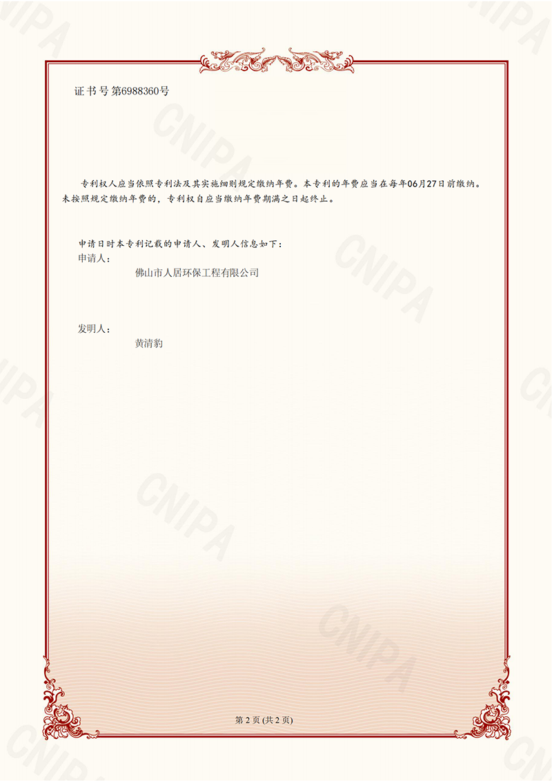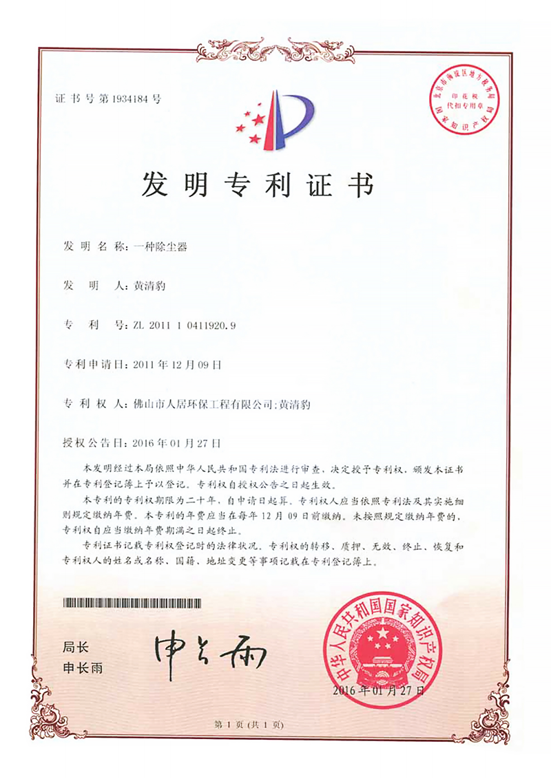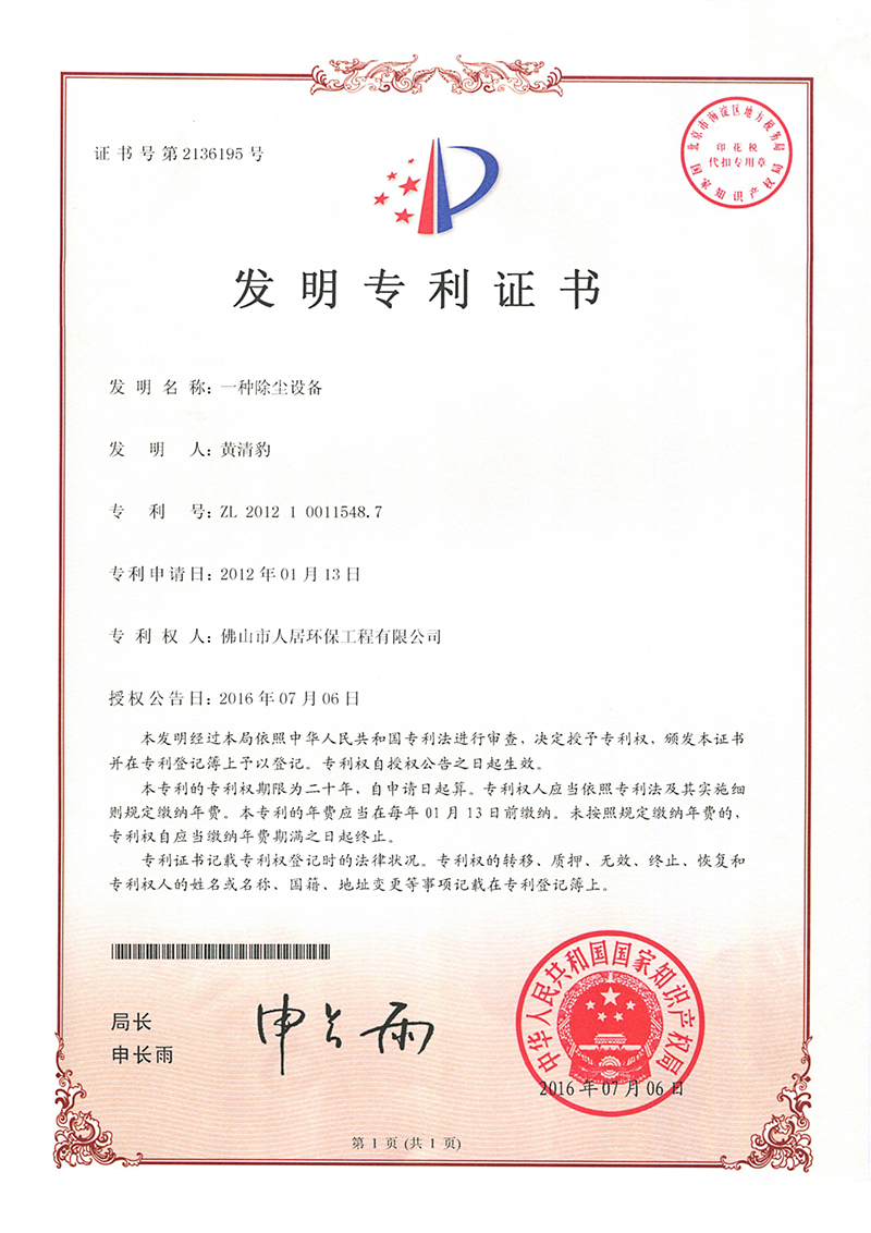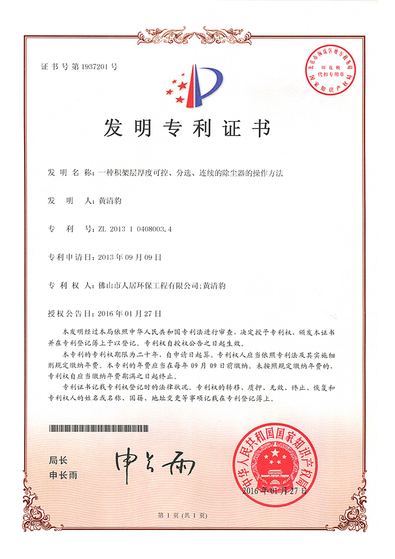 發(fā)明專利證書10:中央除塵系統(tǒng)(人居-2024)