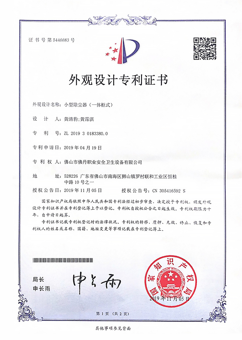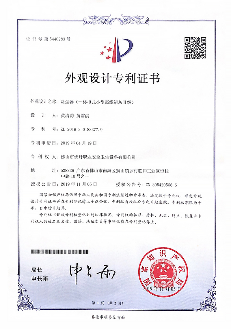 外觀專利1:一體柜式小型除塵器(佛丹-2019) 外觀專利2:一體柜式小型離線清灰Ⅱ級除塵器(佛丹-2019)